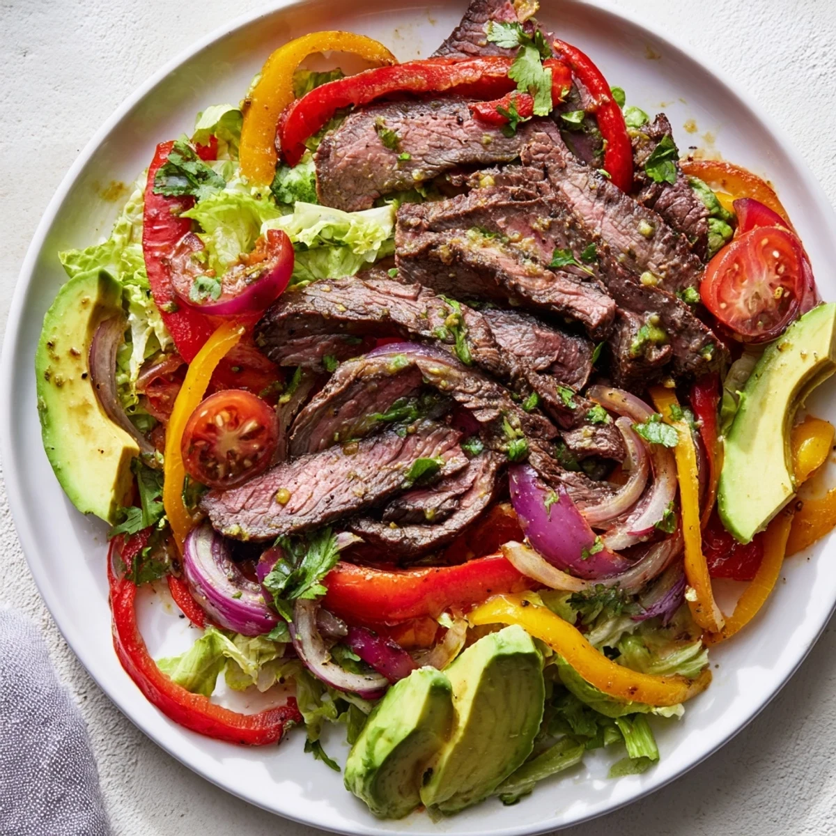 This Tex-Mex inspired dish combines tender marinated beef with sautéed red and yellow peppers, crisp salad greens, cherry tomatoes, and creamy avocado. The fresh lime dressing adds a bright, zesty finish, perfectly tying together the bold, smoky spices and vibrant vegetables. Ready in just over 30 minutes, it balances protein and vegetables for a satisfying, gluten-free main course with layers of flavor in every bite.