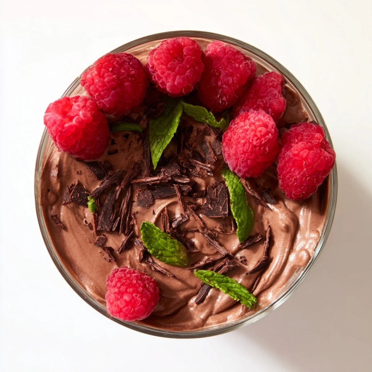 - Right before serving, scatter fresh raspberries over each portion, add a pinch of chocolate shavings or cacao nibs if you have them, and tuck in a mint leaf. Serve cold with a small spoon.