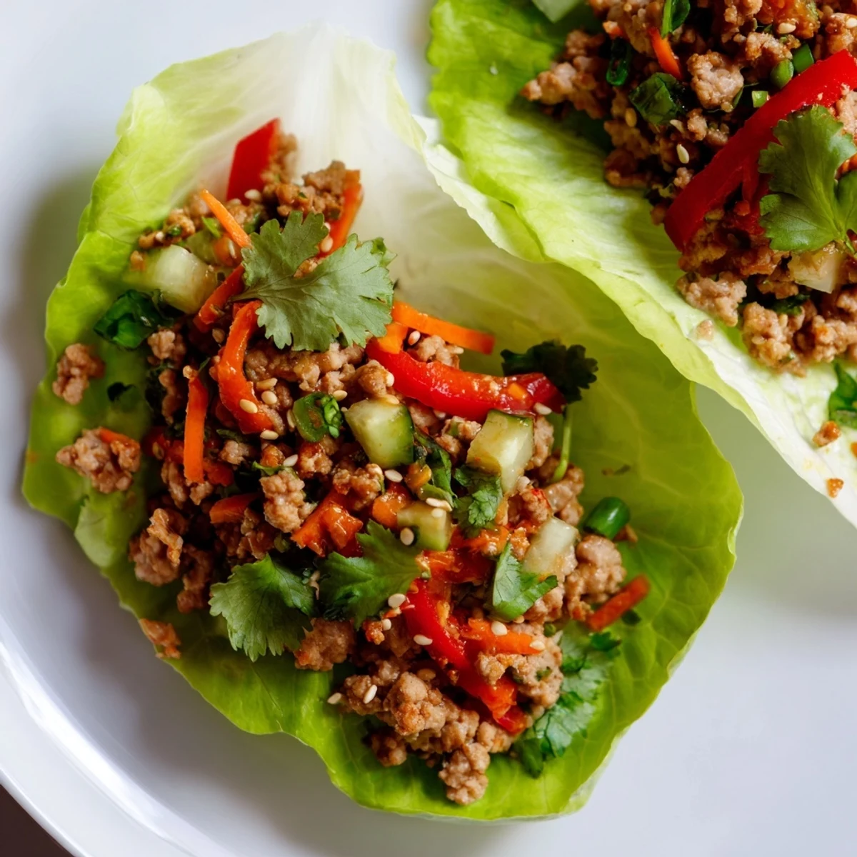 These vibrant lettuce bowls combine lean ground turkey with diced bell peppers, shredded carrots, and crisp cucumber, all tossed in a savory blend of soy sauce, hoisin, and sesame oil. The mixture gets tucked into fresh Romaine or Butter lettuce cups, then topped with bright cilantro, toasted sesame seeds, and zesty lime wedges. Each bowl delivers satisfying protein from the turkey while keeping carbohydrates low and vegetables front and center.