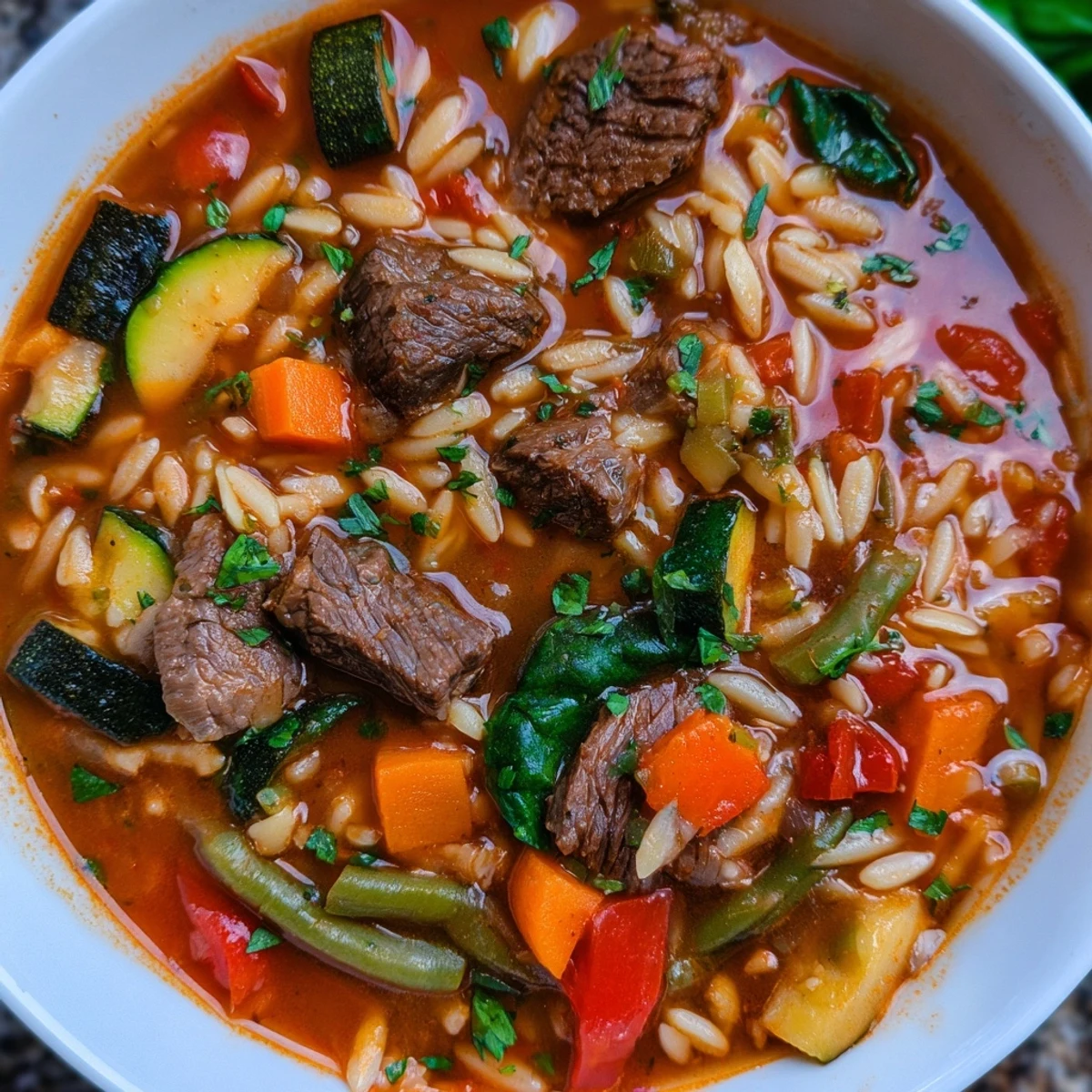 The combination of tender beef, al dente orzo, and vegetables like carrots, celery, bell pepper, zucchini, and green beans creates a well-rounded dish. Fresh spinach adds vibrant color and nutrition right at the end.