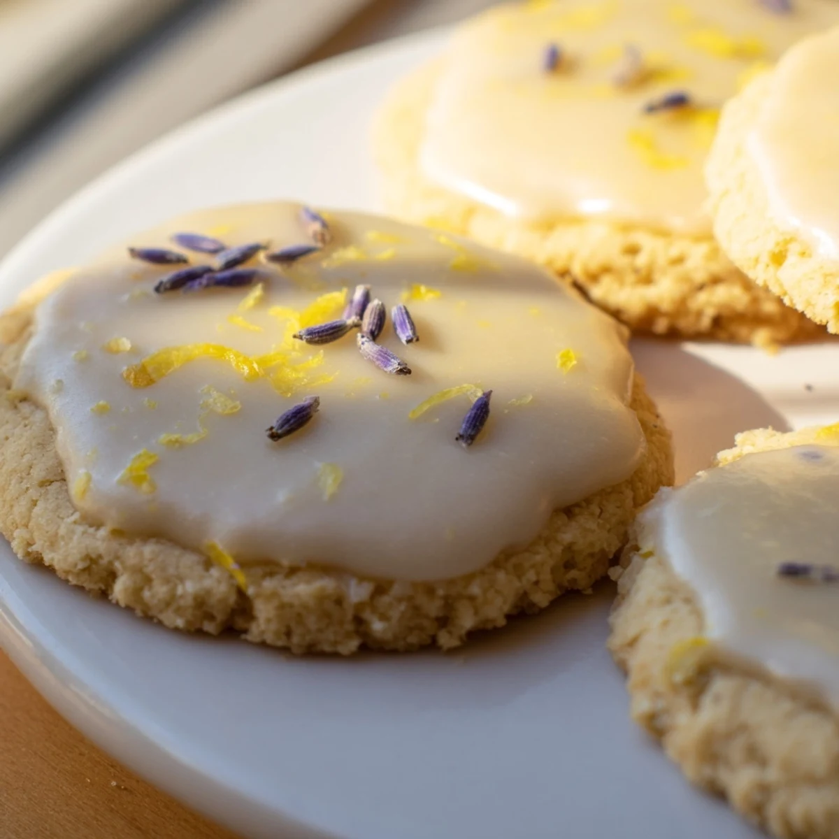 - Drizzle or spread the lemon icing over the completely cooled cookies and optionally sprinkle with a few lavender buds before letting the icing set completely