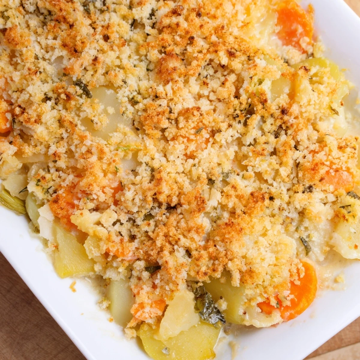 - After 35 minutes, carefully remove the foil from the gratin. You'll see the vegetables have softened and the sauce is bubbling around the edges. Sprinkle that breadcrumb mixture evenly over the top and slide it back in the oven, uncovered, for another 15 minutes. This is when it gets really good. The topping will turn golden brown and crispy while the vegetables finish getting tender. You'll know it's done when the topping is deep golden and the vegetable filling is visibly bubbling at the edges
